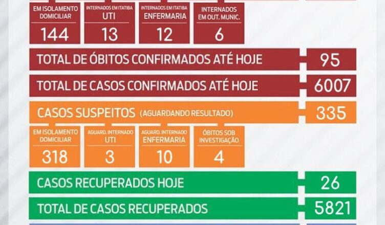 O boletim deste sábado aponta nova morte causada por Covid-19. Trata-se de uma senhora, de 65 anos, com comorbidades, que estava internada. À família, deixamos nossa solidariedade e lamentamos com pesar a perda desta vida. Um dos óbitos suspeitos foi descartado. Quatro aguardam laudo.