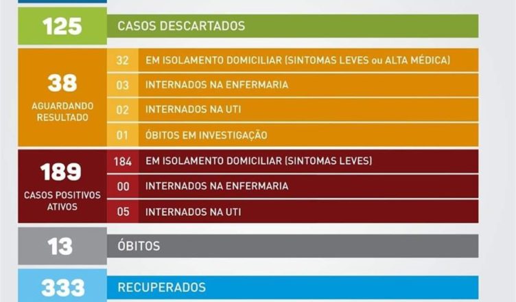 A Secretaria de Saúde informa que neste sábado (11/jul) acrescentou mais 05 casos POSITIVOS ao quadro de acompanhamento, via testes de laboratórios privados e UPA.