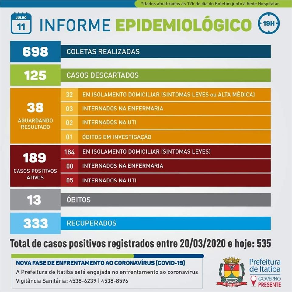Com 2.860 testes feitos, os números mostram que dos 535 itatibenses que foram diagnosticados com a doença, 333 (62%) já superaram a covid-19. 🙏