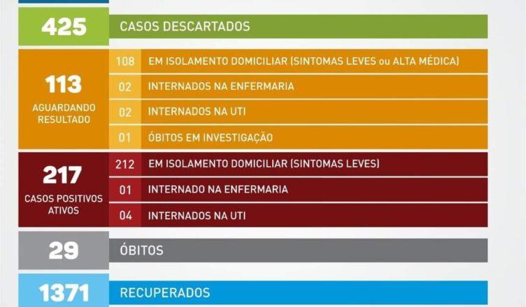 Periodicamente, a Vigilância sanitária atualiza o status de pessoas com diagnóstico confirmado de covid-19. Hoje, 40 são consideradas RECUPERADAS e podem deixar o isolamento doméstico, devendo continuar o uso de máscaras, evitar aglomerações e continuar reforçando a lavagem das mãos.