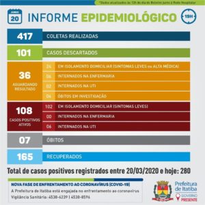 A Secretaria de Saúde informa que neste sábado (20) acrescentou 3 casos POSITIVOS ao quadro de acompanhamento, por meio de testes rápidos realizados na UPA e Santa Casa.