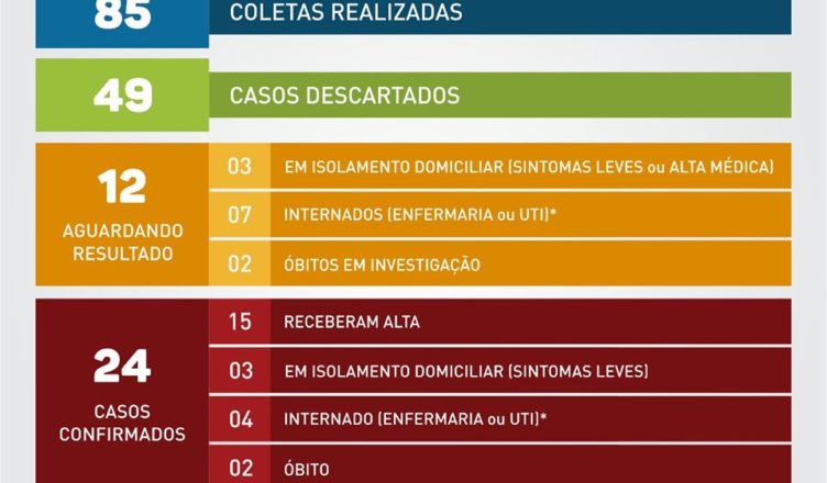 A Secretaria Municipal de Saúde informa que nesta segunda (27), duas coletas foram realizadas para o Instituto Adolfo Lutz: os dois são homens, com idades de 83 (internado na UTI) e 85 anos (internado na enfermaria).