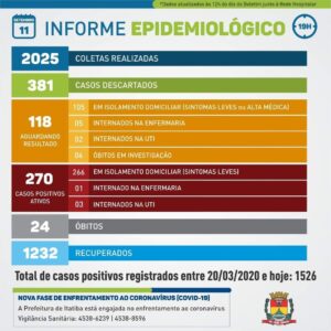 Informamos ainda que foram registrados 16 novos casos, sendo 06 homens e 10 mulheres, com idades entre 18 e 68 anos, moradores dos bairros Santa Filomena (3), Jd. Ester, Santo Antonio, Jd, México, Pq. da Colina I (2), Cruzeiro, Jd. São Luiz II, Jd. Virgínia (2), Jd. Lúcia, Jd. Ipê, Porto Seguro e Jd. Galetto.