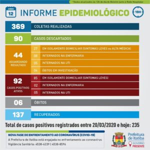– Um homem de 58 anos, que constava como suspeito em nosso quadro de acompanhamento e que estava desde o começo de junho na UTI e possuía comorbidades. O teste rápido realizado na ocasião não foi conclusivo, motivo pelo qual a Prefeitura aguardará resultado do exame do Instituto Adolfo Lutz.