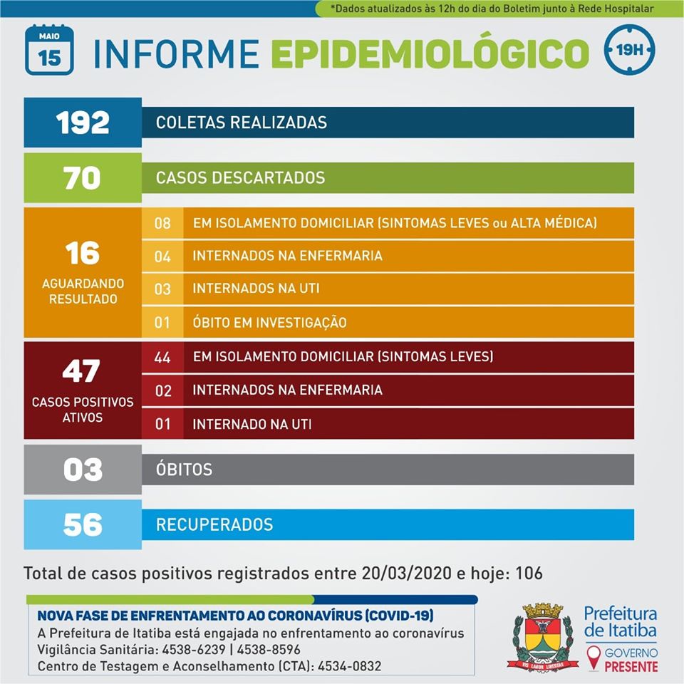 A Secretaria de Saúde informa que nesta sexta (15) acrescentou três casos POSITIVOS ao quadro. Um recebido via Adolfo Lutz, outro via teste rápido da Prefeitura e outro um teste rápido privado.