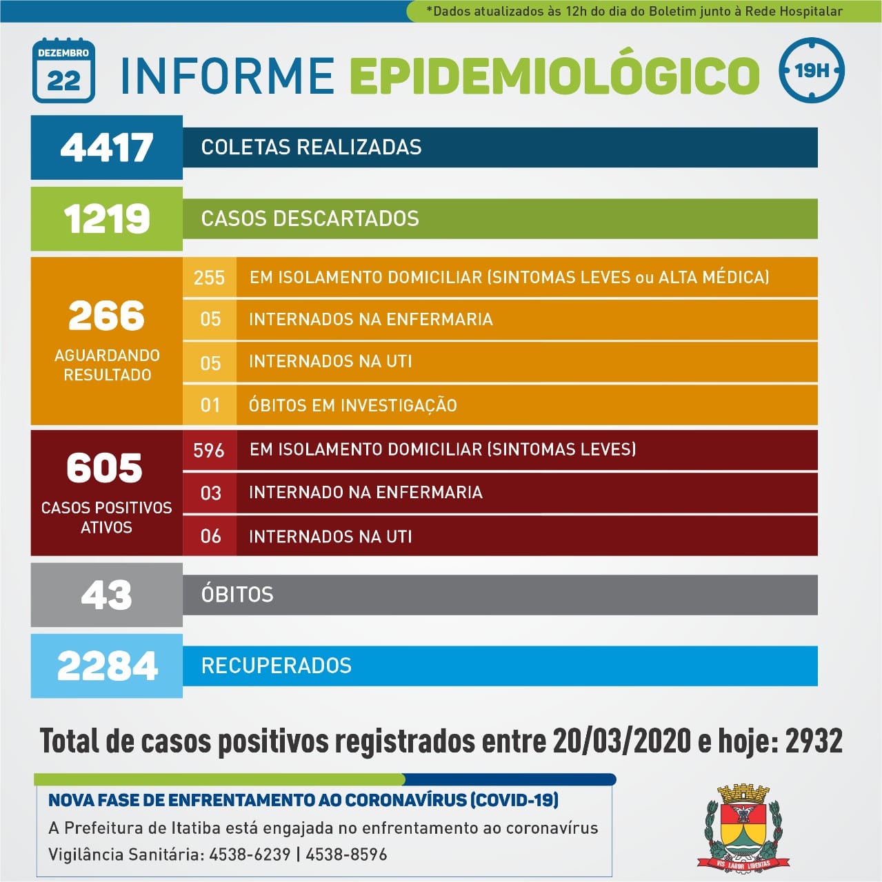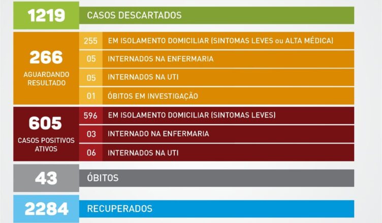 A Secretaria de Saúde informa que nesta terça (22/dez) 102 novos casos foram reportados para a Vigilância Sanitária por meio de testes privados, da Prefeitura e do Instituto Adolfo Lutz. Todos estão em casa.