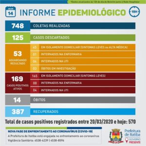 Ingressam no quadro de hoje 13 casos POSITIVOS. São 07 mulheres e 06 homens, com 69, 46, 49, 52, 41, 29, 30, 62, 42 (2), 28, 39 e 48 anos, moradores dos bairros Pq. San Francisco (5), Giardino D’Itália (2), Dr. Pimenta/CECAP, Santa Cruz, Engenho D’Água, Beija-Flor, Vila Ravenna e Santa Terezinha. Todos estão cumprindo isolamento social em casa.