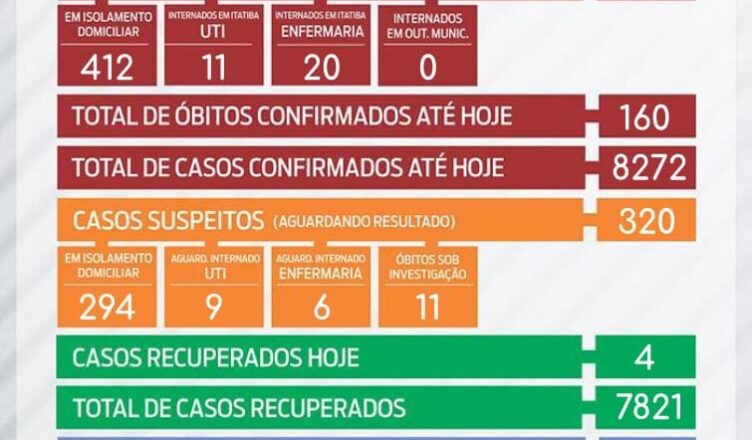 Quatro cidadãos saíram da quarentena, considerados recuperados. Foram registrados três óbitos de casos confirmados e um suspeito. Tratam-se de dois senhores, de 65 e 69 anos, com comorbidades, e uma senhora de 61 anos. Lamentamos com pesar e deixamos às famílias enlutadas nossa solidariedade.