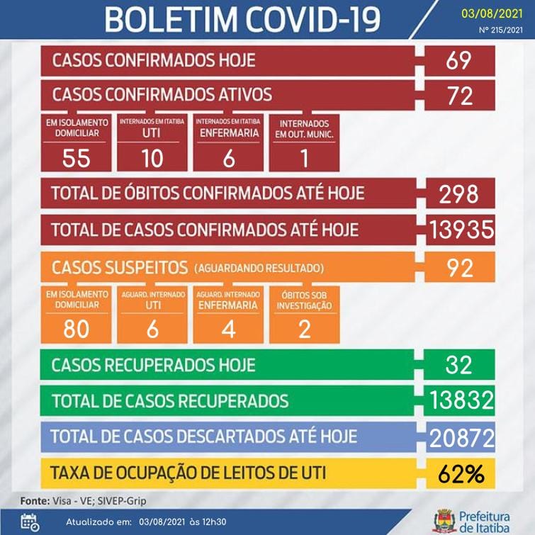 A taxa de ocupação da UTI Covid passou a 62% nesta terça-feira, 03/08. Nas últimas 24 horas, houve o registro de 69 casos confirmados de Covid-19, enquanto 32 pessoas deixaram a quarentena, depois de cumprirem o período recomendado de isolamento. Foram feitos ainda 295 testes de detecção da doença.