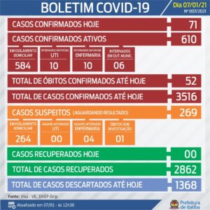 Itatiba soma mais 71 novos casos de Covid-19, segundo boletim desta quinta-feira, 07 de janeiro. Uma pessoa morreu – uma mulher de 60 anos, que tinha comorbidades. Nossa solidariedade à família. Com esse óbito, o município chega a um total de 52 vítimas de coronavírus desde o início da pandemia ,em março do ano passado.