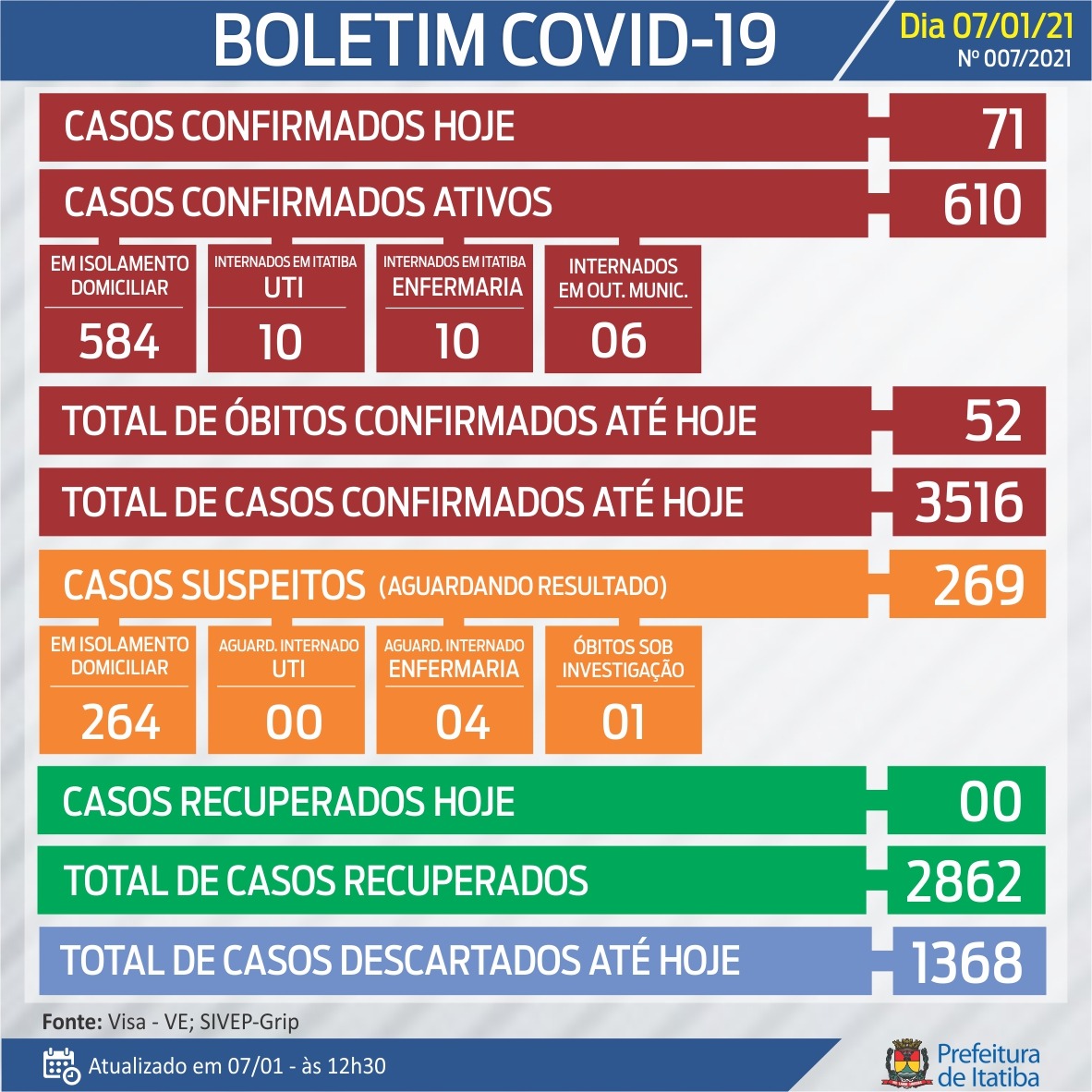 Itatiba soma mais 71 novos casos de Covid-19, segundo boletim desta quinta-feira, 07 de janeiro. Uma pessoa morreu – uma mulher de 60 anos, que tinha comorbidades. Nossa solidariedade à família. Com esse óbito, o município chega a um total de 52 vítimas de coronavírus desde o início da pandemia ,em março do ano passado.