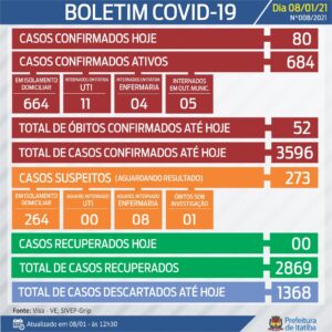 O boletim registra 11 cidadãos com casos ativos internadas na UTI e 4 na enfermaria. São 684 positivos ativos, sendo 664 em isolamento domiciliar e 264 suspeitos, em igual condição. Foram realizados 82 testes, e nenhum novo óbito.