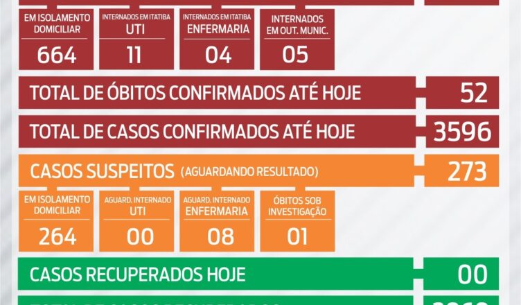 O boletim registra 11 cidadãos com casos ativos internadas na UTI e 4 na enfermaria. São 684 positivos ativos, sendo 664 em isolamento domiciliar e 264 suspeitos, em igual condição. Foram realizados 82 testes, e nenhum novo óbito.