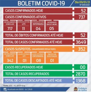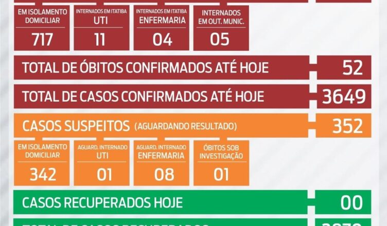 Foram computados 52 novos casos. De ontem para hoje, 133 pessoas foram testadas, sendo que a maioria, 80, negativas para coronavírus. Mais informações: http://www.itatiba.sp.gov.br/coronavirus/