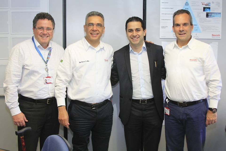 Foto: Rubens Rocha, gerente de Service da Bosch Rexroth, Manfred Al-Kayal, General Manager da empresa na América do Sul e Antonio Cunha, Diretor Financeiro, Administrativo e Controladoria com o prefeito Douglas Augusto Pinheiro de Oliveira, durante confirmação da vinda da empresa.