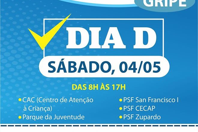 A Secretaria de Saúde da Prefeitura de Itatiba realiza neste sábado,4, o Dia “D” de Vacinação contra a Influenza. As doses serão distribuídas das 8h às 17h nos seguintes locais: CAC (Centro de Atenção à Criança), Parque da Juventude, PSF San Francisco I, PSF CECAP e PSF Zupardo. Poderão se vacinar: idosos (pessoas com mais de 60 anos), trabalhadores da saúde, professores, pessoas com doenças crônicas, gestantes e puérperas (mulheres com até 45 dias de pós-parto), além de crianças de 6 meses a 5 anos (5 anos, 11 meses e 29 dias).