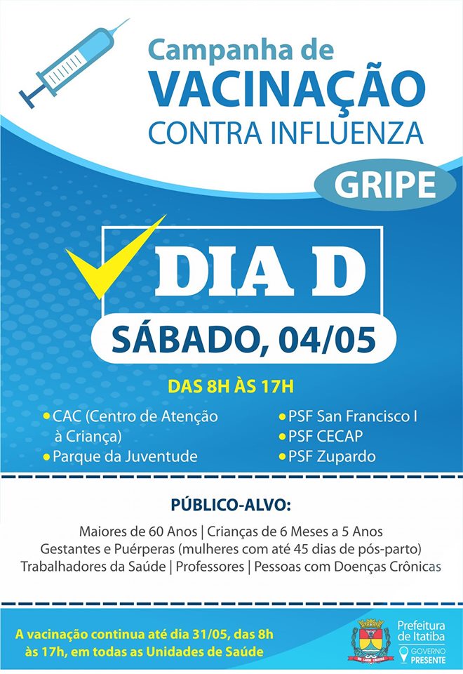 A Secretaria de Saúde da Prefeitura de Itatiba realiza neste sábado,4, o Dia “D” de Vacinação contra a Influenza. As doses serão distribuídas das 8h às 17h nos seguintes locais: CAC (Centro de Atenção à Criança), Parque da Juventude, PSF San Francisco I, PSF CECAP e PSF Zupardo. Poderão se vacinar: idosos (pessoas com mais de 60 anos), trabalhadores da saúde, professores, pessoas com doenças crônicas, gestantes e puérperas (mulheres com até 45 dias de pós-parto), além de crianças de 6 meses a 5 anos (5 anos, 11 meses e 29 dias).