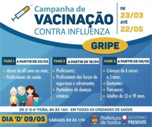 Também no dia 09/05 acontece o “Dia D” da vacinação onde todas as unidades de saúde estarão de plantão para vacinar a população que se enquadra no público-alvo da campanha.
