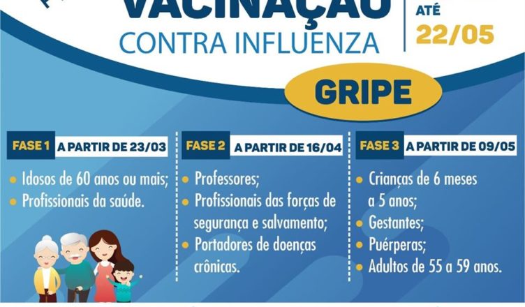 Em virtude do avanço de casos de coronavírus, o Ministério da Saúde antecipou a campanha nacional de vacinação contra a influenza, com início nesta segunda-feira, dia 23 de março. A meta é vacinar 90% dos grupos elegíveis.
