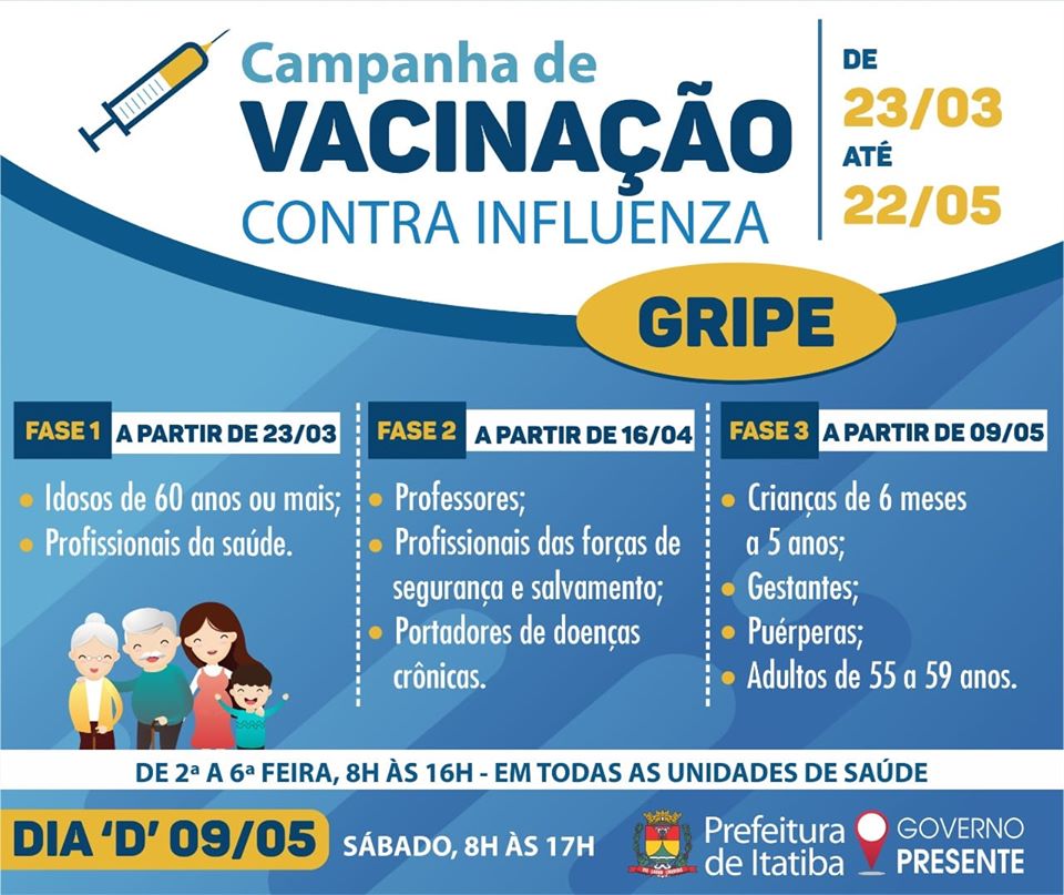 “A vacina nessa primeira etapa da campanha estará disponível para todos os profissionais da saúde do setor público e privado, por serem os profissionais que estarão na linha de frente dos atendimentos a todos que apresentarem síndromes gripais, inclusive casos de coronavírus, caso venham a aparecer em nossa cidade. Além dos profissionais da saúde, toda população acima de 60 anos também deverá ser imunizada. A vacina estará disponível em todas as unidades de saúde das 8 às 16 horas de segunda à sexta-feira, podendo o horário ser estendido conforme a necessidade. No Ambulatório Central de Especialidades, a vacina será realizada no auditório com entrada pelo lado externo para evitar o fluxo aumentado de pessoas circulando no local. Serão distribuídas senhas se a procura for muito grande para evitar a espera dentro dos locais fechados. Solicitamos a todos que sigam as condutas de etiqueta respiratória que vem sendo amplamente divulgadas pelas notas do Ministério da Saúde”, explicou o Secretário Municipal de Saúde, Dr. Fabio Nani.