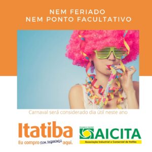 A Associação Industrial e Comercial de Itatiba (Aicita) informa que neste ano de 2021, devido à pandemia do coronavírus, o Carnaval será considerado dia útil, ao contrário de ser ponto facultativo, como em outros anos.
