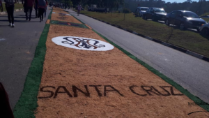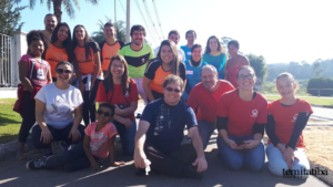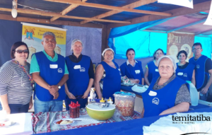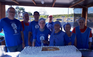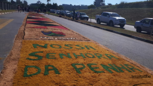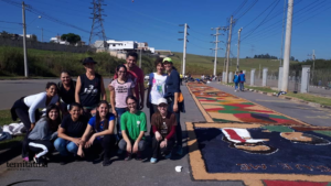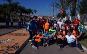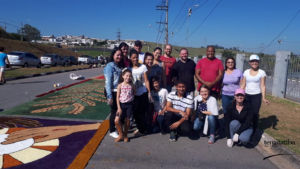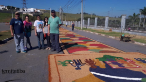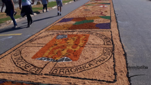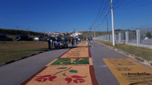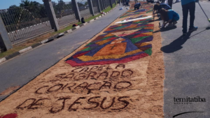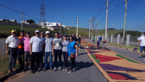 O tapete de serragem foi feito pelos voluntários por volta das 5h30 da manhã de hoje e é uma das atrações mais lindas, são 500 metros de cores e trabalhos delicados que enchem os olhos de quem passa pela rua lateral ao Parque. Estivemos hoje por volta das 10h para conferir de perto e fotografamos alguns dos muitos voluntários que, com mãos abençoadas, realizaram este belíssimo trabalho.