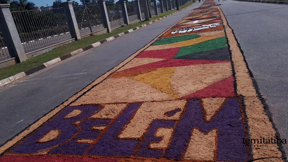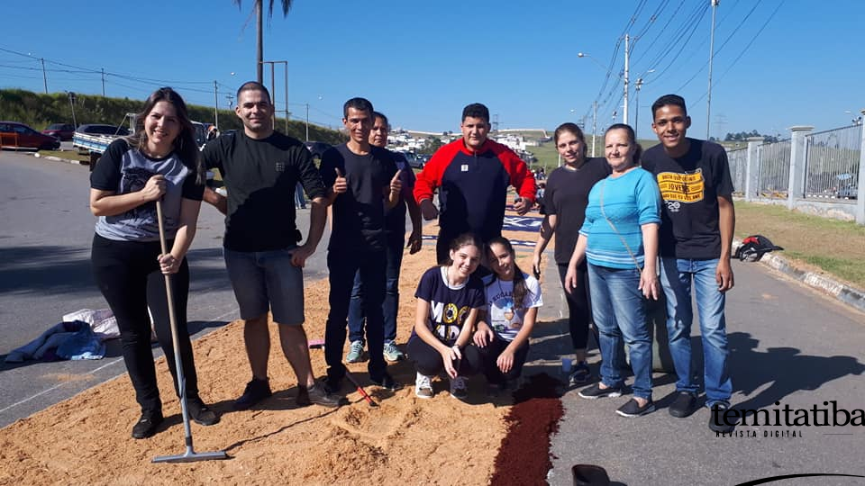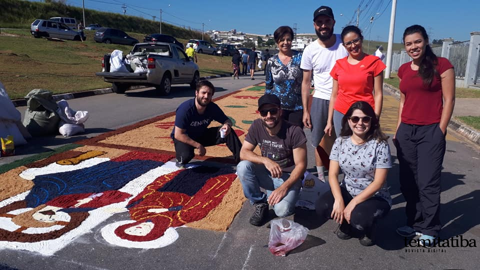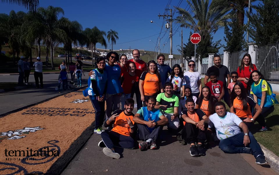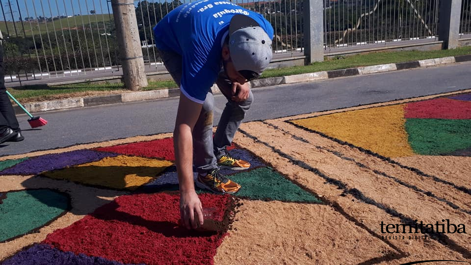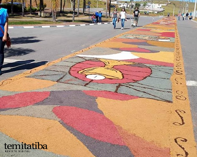 O tapete de serragem foi feito pelos voluntários por volta das 5h30 da manhã de hoje e é uma das atrações mais lindas, são 500 metros de cores e trabalhos delicados que enchem os olhos de quem passa pela rua lateral ao Parque. Estivemos hoje por volta das 10h para conferir de perto e fotografamos alguns dos muitos voluntários que, com mãos abençoadas, realizaram este belíssimo trabalho.