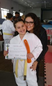 Outra que se destacou durante o exame foi a pequena Iris Gabriela Piovanni, que as vésperas de seu aniversário de 10 anos, conquistou a nota máxima e foi direto para a faixa laranja. “É muita felicidade que não cabe dentro do meu corpo”, contou Iris. “Eu tava muito nervosa para o exame, mas a gente esconde o nervosismo, dá um jeito”, brincou ela, contando o seu segredo para esconder o nervosismo. Iris estava acompanhada da mãe, Thais Gabriela Piovanni, que ressaltou o empenho da filha. “Ela é muito dedicada, treina bastante, chega em casa e já começa a treinar, o pai também pratica artes marciais então ela pede para ele ajudar nas posições, a mãe também é um pouquinho exigente”, contou.