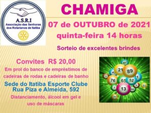 Chamiga setembro 7, 2021admin No dia 07 de outubro, teremos o CHAMIGA, no salão nobre do Itatiba Esporte Clube, e seguindo todos os protocolos de higiene da OMS e vigilância sanitária de Itatiba. **Divulgação Tem Itatiba**