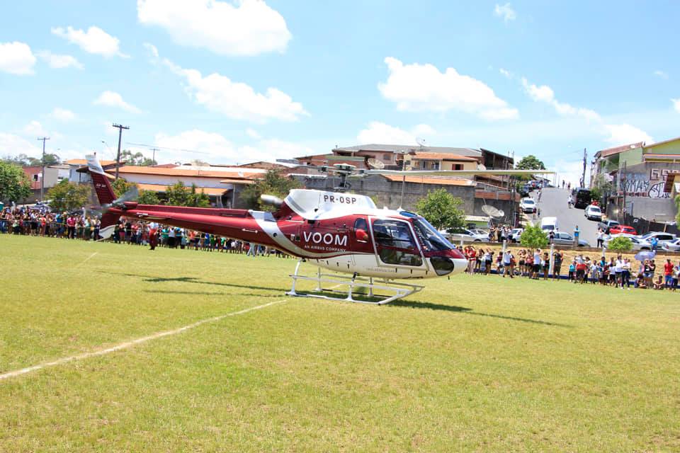 O domingo (8) amanheceu com sol e sem nuvens. Céu perfeito para centenas de pessoas olharem para o alto para acompanharem a chegada do Papai Noel no campo de futebol de Pq. San Francisco. O Bom Velhinho pousou de helicóptero no centro do gramado.