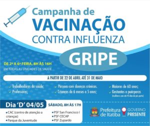 Em Itatiba, as doses da vacina estão disponíveis gratuitamente em todas as Unidades Básicas de Saúde das 8h às 16h, e o Dia “D” está programado para o dia 04 de maio, das 8h às 17h nos seguintes locais: CAC (Centro de Atenção a Crianças), Parque da Juventude, PSF San Francisco I, PSF CECAP, PSF Zupardo.