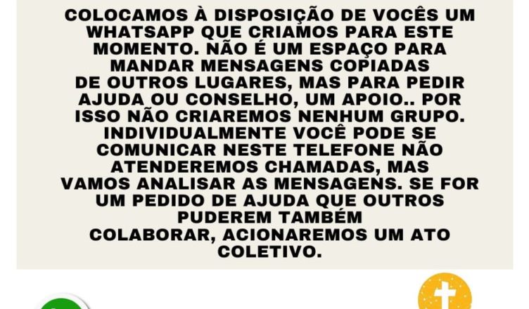 “Este telefone é o contato da solidariedade. Não mande mensagens. Somente pedidos de ajuda! Eu agradeço a cada pessoa que se colocar a disposição de ser anjo de alguém. Deus abençoe a todos”.