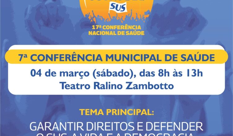 A Prefeitura de Itatiba, por meio da Secretaria de Saúde de Itatiba e o Conselho Municipal de Saúde, realizará neste sábado (04/03) a 7a. Conferência Municipal de Saúde. Por meio do Programa Inova Saúde, será das 8h às 13h, no Teatro Ralino Zambotto.