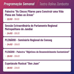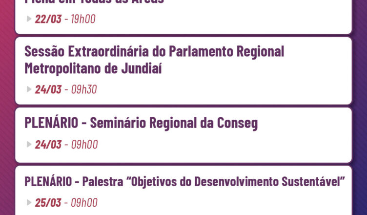 Também na quinta, só que no Teatro, haverá reunião do Parlamento Metropolitano de Jundiaí com a finalidade de nomear os membros das comissões temáticas. A entrada é livre.