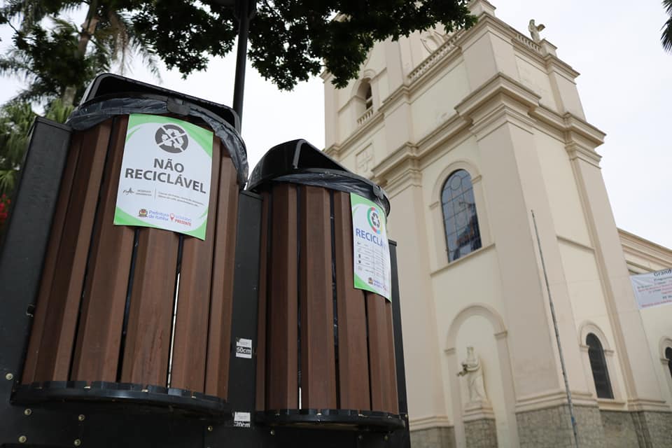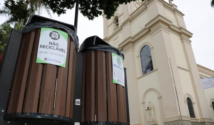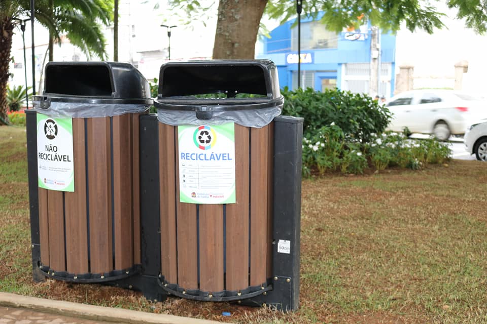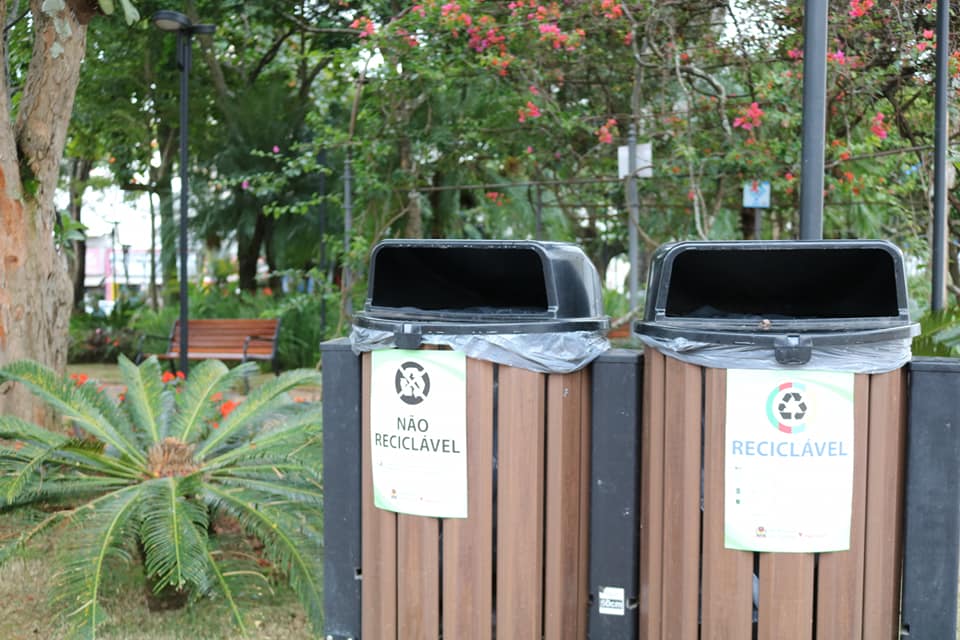 Os conjuntos de coletores de resíduos recicláveis e orgânicos da Praça da Bandeira receberam novas placas explicativas. No lugar das antigas placas que especificavam os coletores apenas como “Reciclável” ou “Não Reciclável”, foram fixadas placas com conteúdo mais elaborado, diferenciando minuciosamente os resíduos que podem ser reaproveitados, separando-os em categorias, dos que não podem passar pelo processo de reaproveitamento.