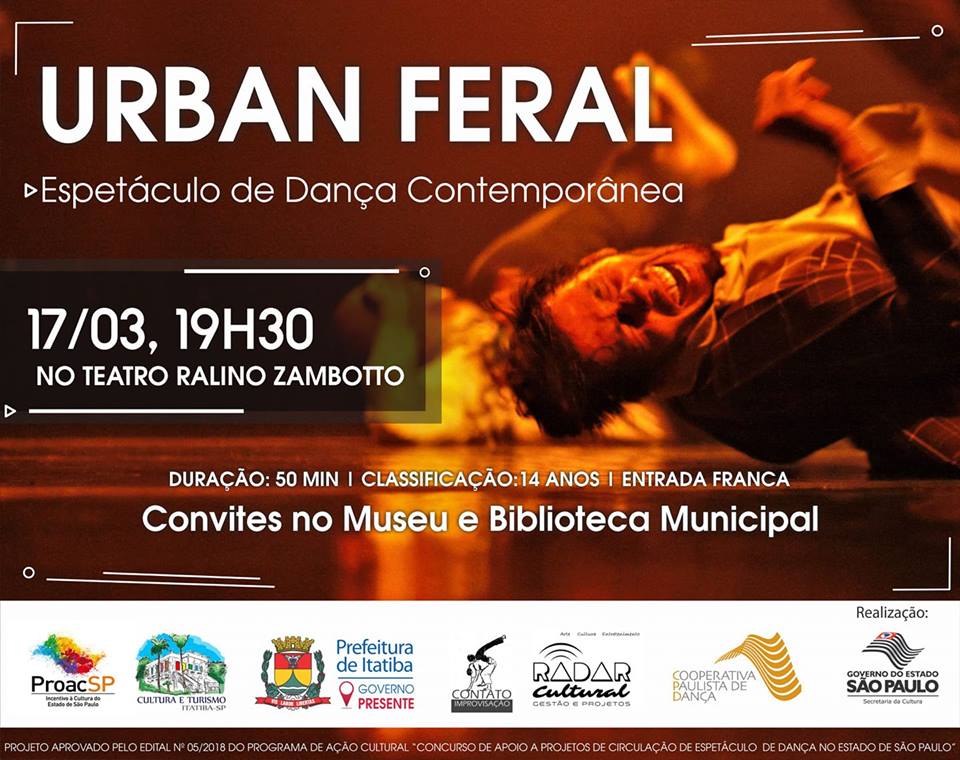 A Prefeitura de Itatiba, por meio da Secretaria de Cultura e Turismo, convida para o Espetáculo de Dança Contemporânea: Urban Feral.