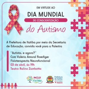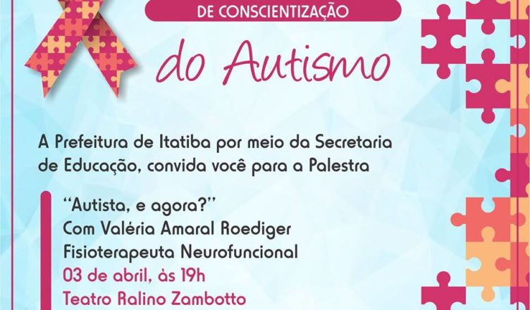 Em virtude do Dia Mundial de Conscientização do Autismo, a Prefeitura de Itatiba, através da Secretaria de Educação realizará a Palestra “Autista, e agora?”, com a fisioterapeuta neurofuncional Valéria Alves do Amaral Roediger, na próxima quarta-feira,3 de abril, às 19h, no Teatro Ralino Zambotto. Participe!