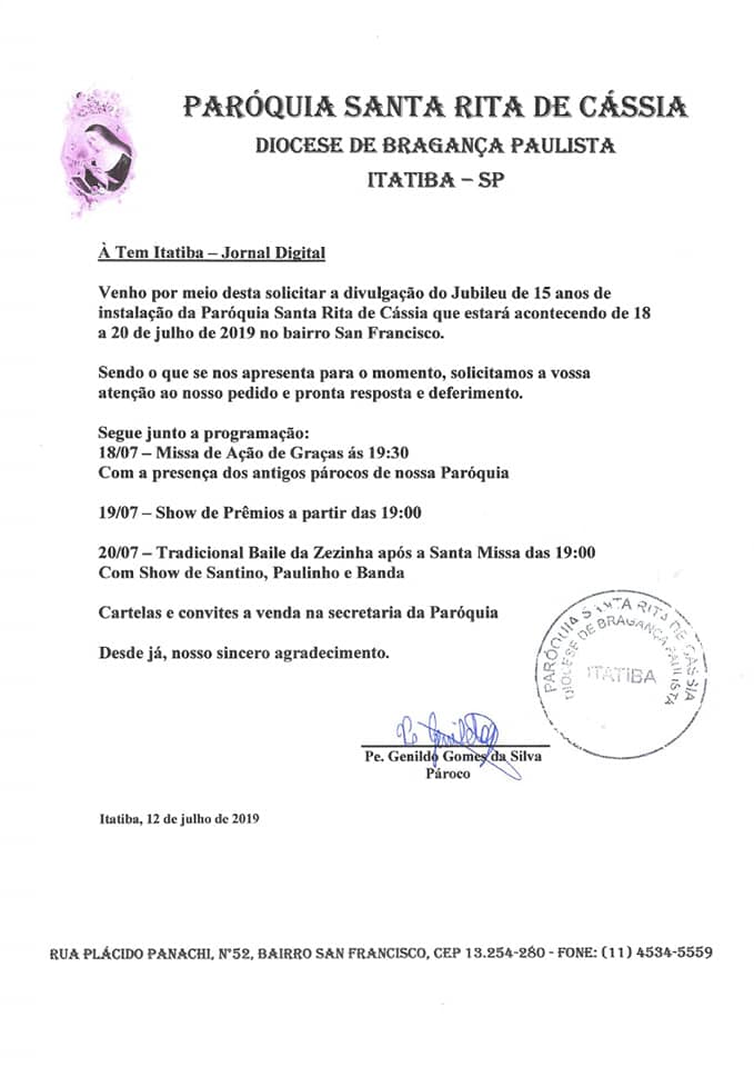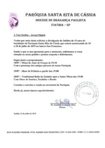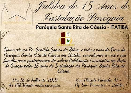 Recebemos do Padre Genildo Gomes da Silva o convite para a Celebração Eucarística pelos 15 anos de instalação da Paróquia Santa Rita de Cássia.