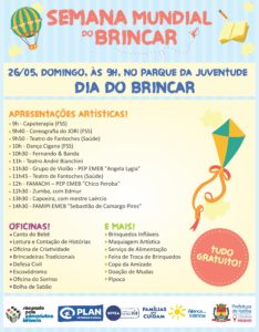 Neste domingo, 26, das 09h às 15h, acontece o Dia do Brincar, no Parque da Juventude, em Itatiba. O evento contará com diversas apresentações artísticas, brincadeiras, brinquedos infláveis, feira de trocas de brinquedos, e muito mais, além da apresentação da coreografia itatibense campeã do JORI 2019 (Jogos Regionais do Idoso). O Dia do Brincar faz parte da Semana Mundial do Brincar. Participe!