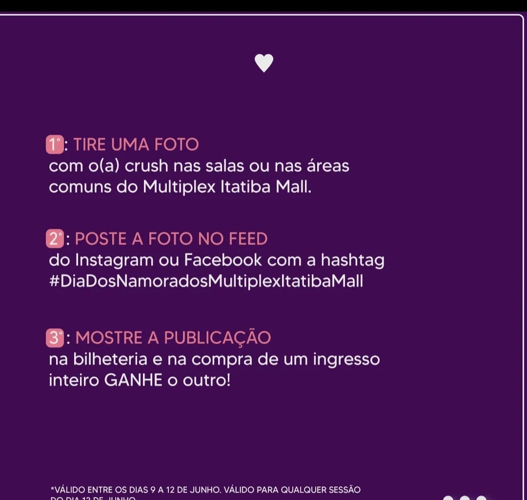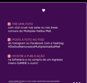 Dia dos Namorados no Multiplex Itatiba Mall junho 8, 2022junho 10, 2022admin O Dia dos Namorados é melhor com PROMOÇÃO! Traga seu crush para tirar uma foto romântica no Multiplex e GANHE um ingresso. Aproveite que o amor está no ar e arraste pro lado para participar! #VocêNoMultiplex tem tudo.