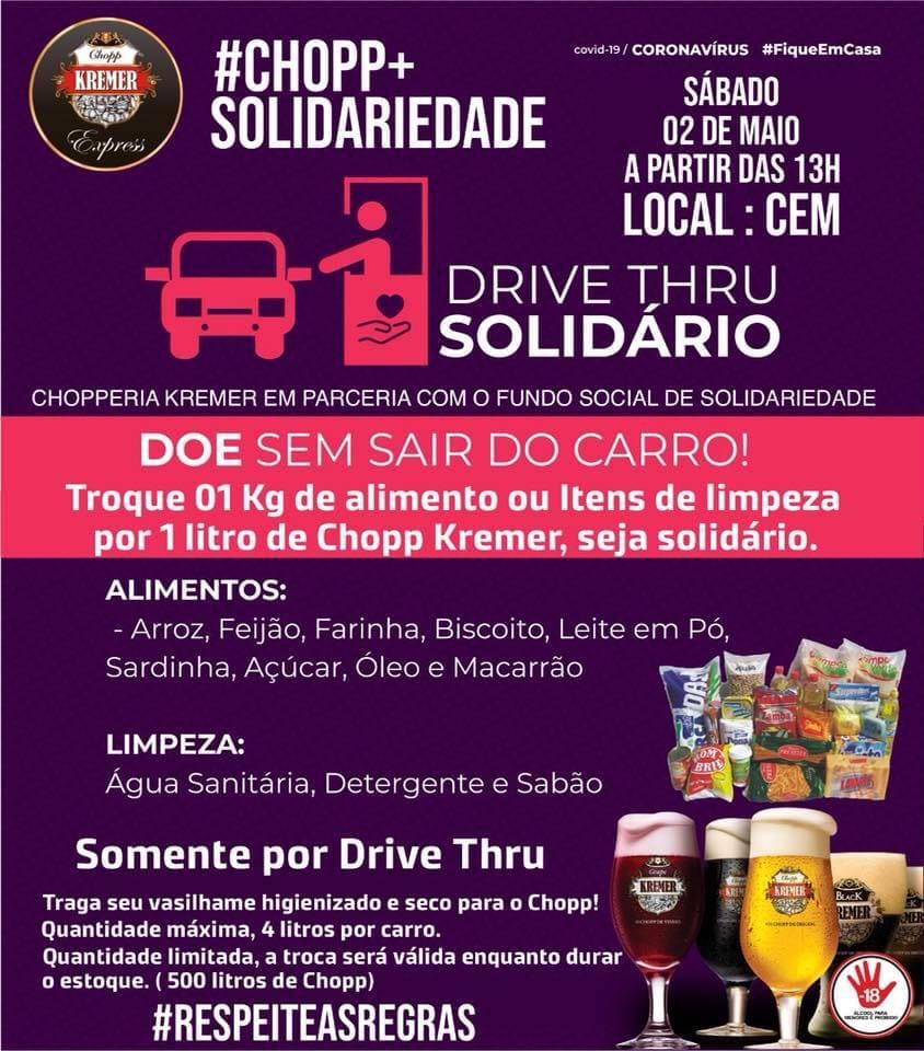 🍺 Quantidade limitada a 4 litros de Chopp por carro, mas você pode levar mais de 4 kg de alimento! Quanto mais, melhor!