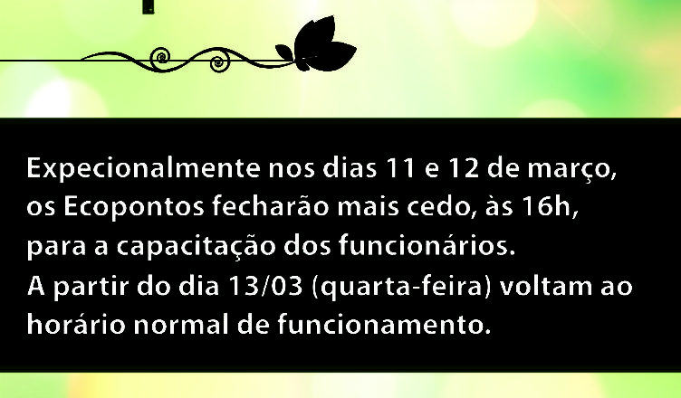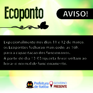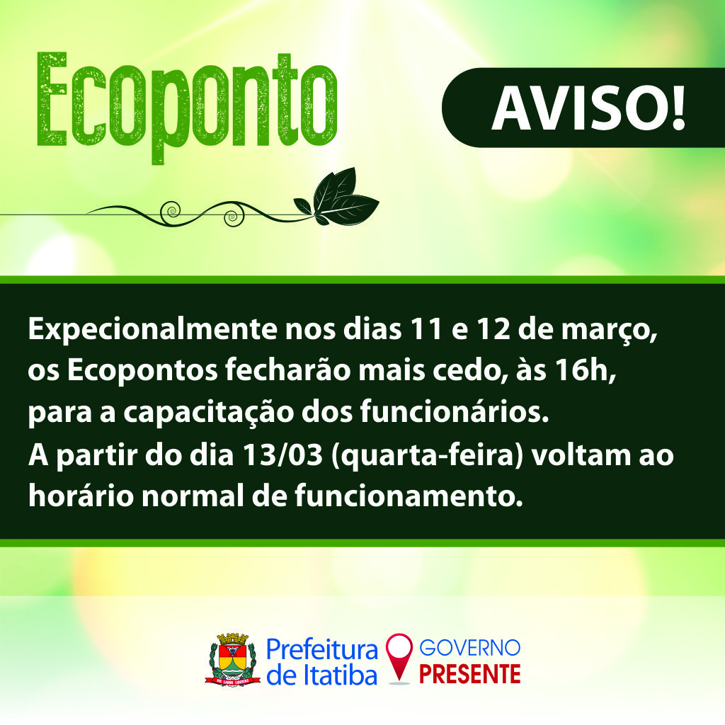 A Secretaria de Meio Ambiente e Agricultura de Itatiba informa que nos dias 11 e 12 de março, excepcionalmente, os Ecopontos fecharão mais cedo, às 16h, para capacitação dos funcionários. A partir do dia 13 de março (quarta-feira), o funcionamento volta ao horário normal, sempre das 8h às 11h30 e das 13h às 17h30.