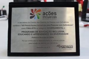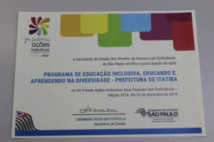 As ações inclusivas da Secretaria da Educação de Itatiba foram finalistas do “Prêmio Ações Inclusivas Para Pessoas com Deficiência” organizado pela Secretaria dos Direitos da Pessoa com Deficiência do Governo do Estado de São Paulo.