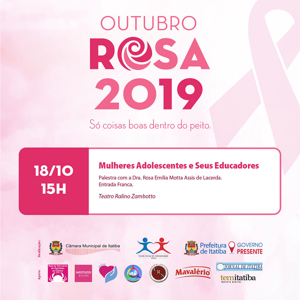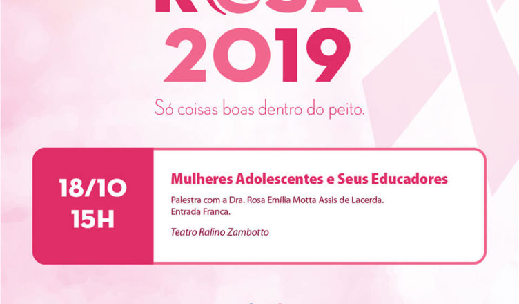 Sexta-feira (18) haverá mais uma palestra do Outubro Rosa da Câmara. Desta vez, quem falará é a ginecologista Rosa Emília Lacerda sobre “Mulheres adolescentes e seus educadores”. O evento ocorrerá às 15h, no Teatro Ralino Zambotto.