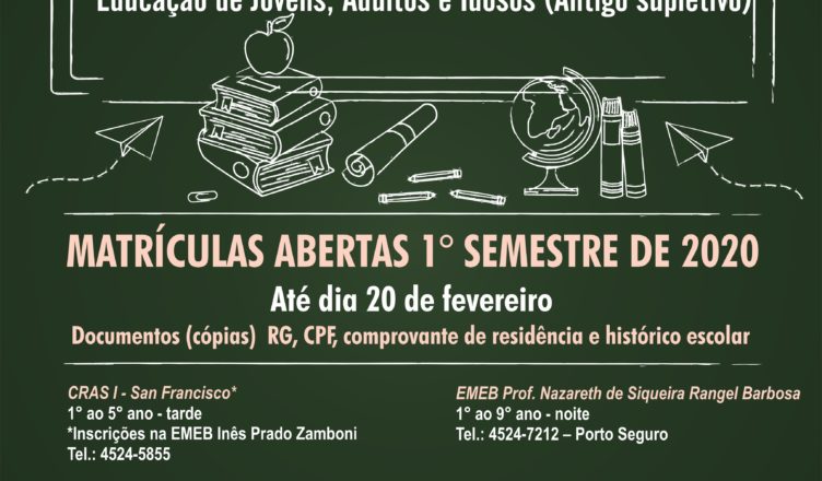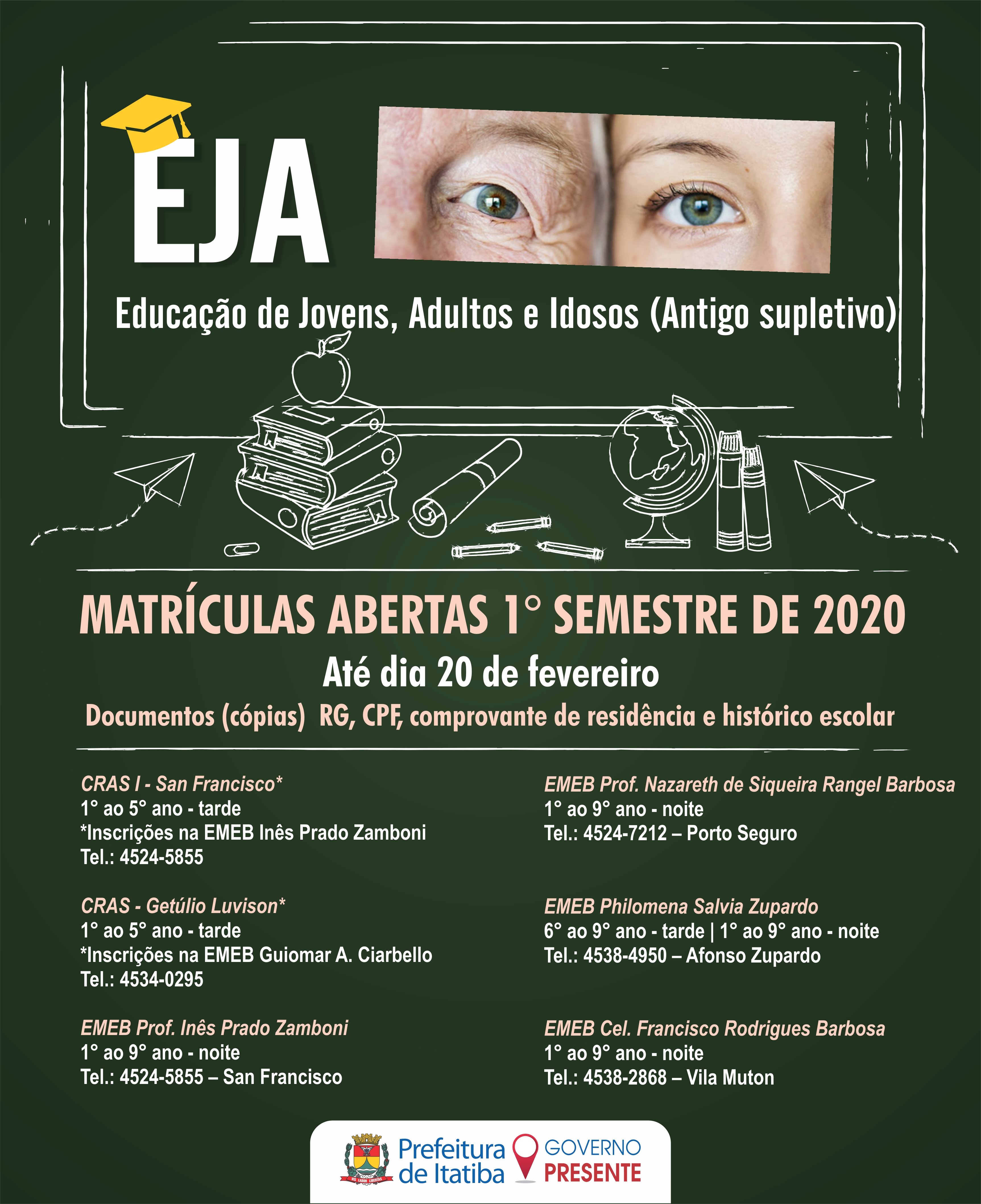 A Prefeitura de Itatiba por meio da Secretaria de Educação abriu as matrículas para o 1º semestre de 2020 da EJA – Educação de Jovens, Adultos e Idosos, conhecido antigamente como supletivo.