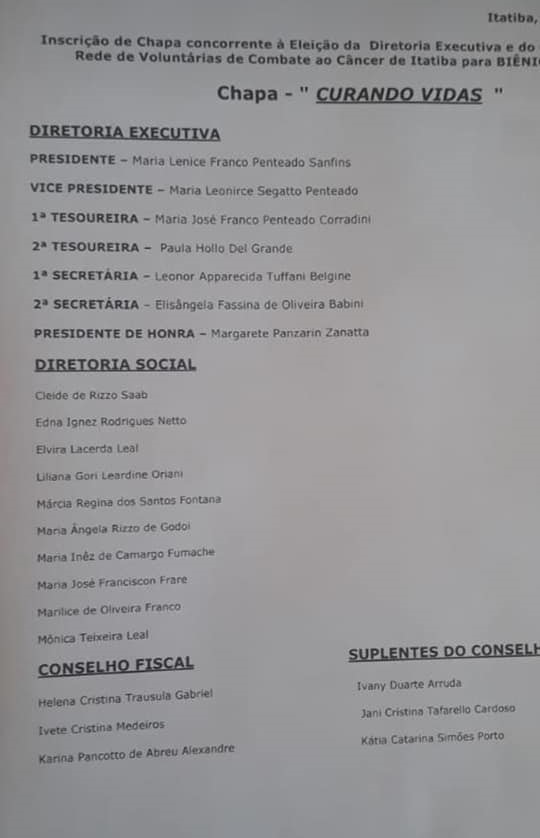 Ontem, dia 01,foi realizada, na Sede da Rede de Voluntárias de Comabte ao Câncer de Itatiba, a eleição para a nova Diretoria e Conselho Fiscal para o Biênio 2021/2023, com o número regimental mínimo, segundo o Estatuto da Entidade .