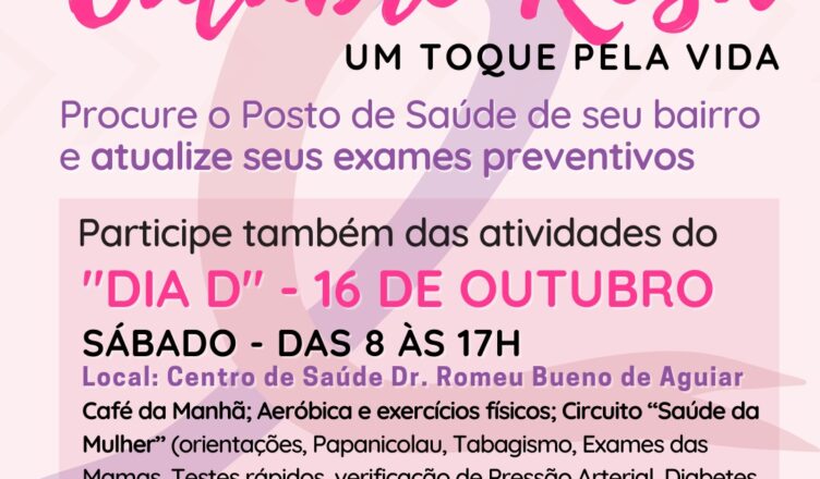 O “Dia D” do Outubro Rosa em Morungaba será promovido no dia 16 de outubro, das 8 às 17 horas, no Centro de Saúde “Dr. Bueno de Aguiar”, com um café da manhã para as mulheres e uma programação com atividades físicas e diversas mesas temáticas: Papanicolau, Tabagismo, Exames das Mamas, Testes rápidos, verificação de Pressão Arterial, Diabetes, Odontologia e Vacinas.