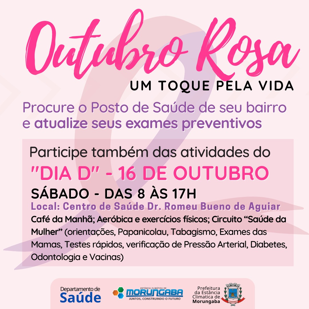 O “Dia D” do Outubro Rosa em Morungaba será promovido no dia 16 de outubro, das 8 às 17 horas, no Centro de Saúde “Dr. Bueno de Aguiar”, com um café da manhã para as mulheres e uma programação com atividades físicas e diversas mesas temáticas: Papanicolau, Tabagismo, Exames das Mamas, Testes rápidos, verificação de Pressão Arterial, Diabetes, Odontologia e Vacinas.