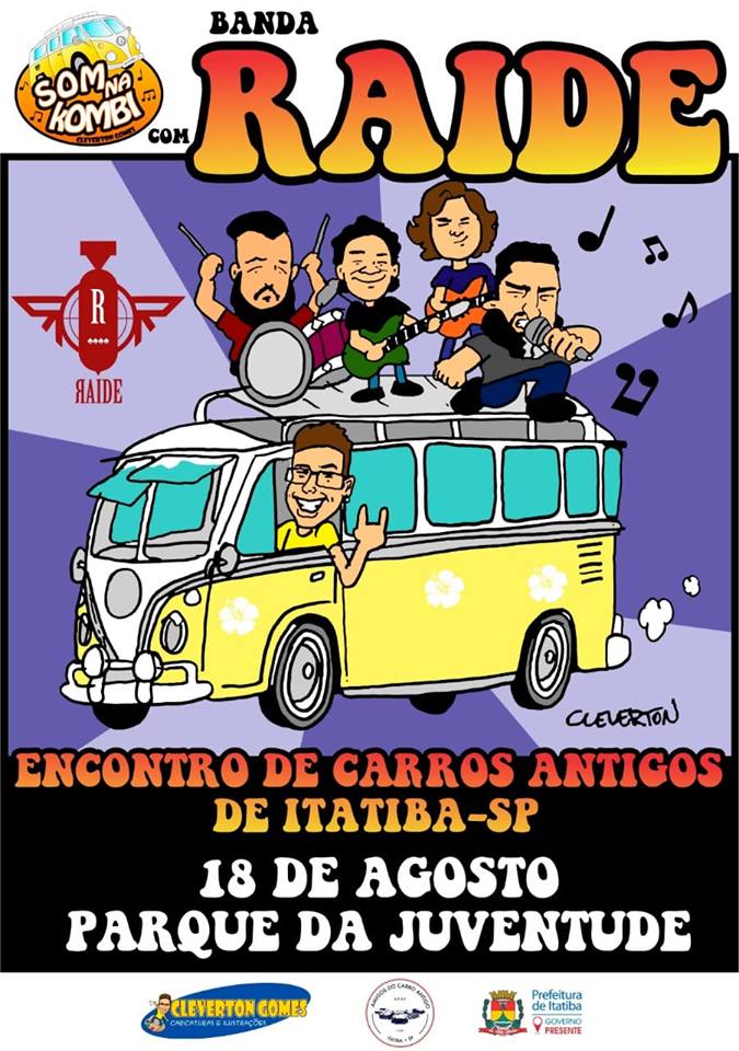 O projeto “Som na Kombi” idealizado pelo artista plástico Cleverton Gomes levará a Banda Raide para o Parque da Juventude, no Encontro de Carros Antigos, dia 18 de agosto de 2019, das 9h às 15h, conforme divulgamos no Tem Itatiba.