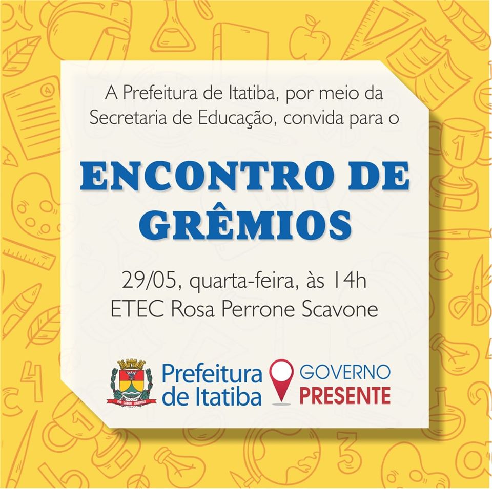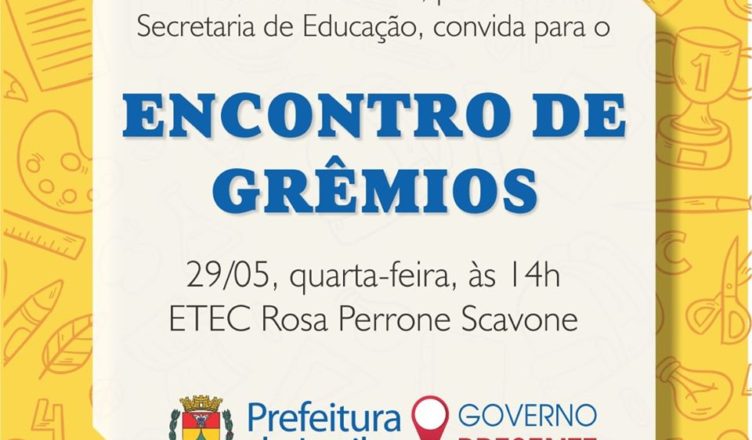 Nesta quarta-feira,29, a partir das 14h, o Auditório da ETEC Rosa Perrone Scavone recebe o “Encontro de Grêmios”, para apresentação dos Gritos de Guerra. Você é nosso convidado!